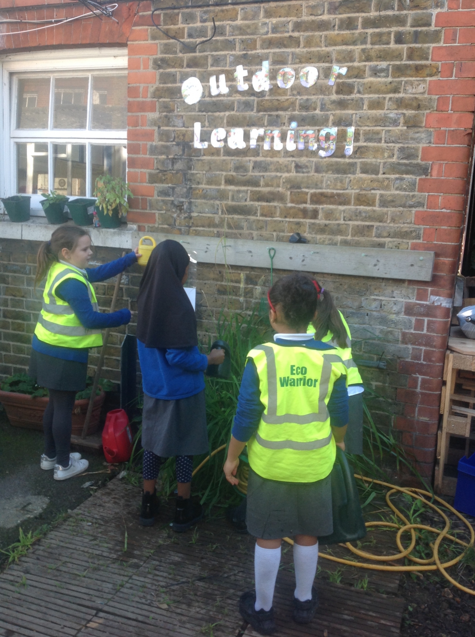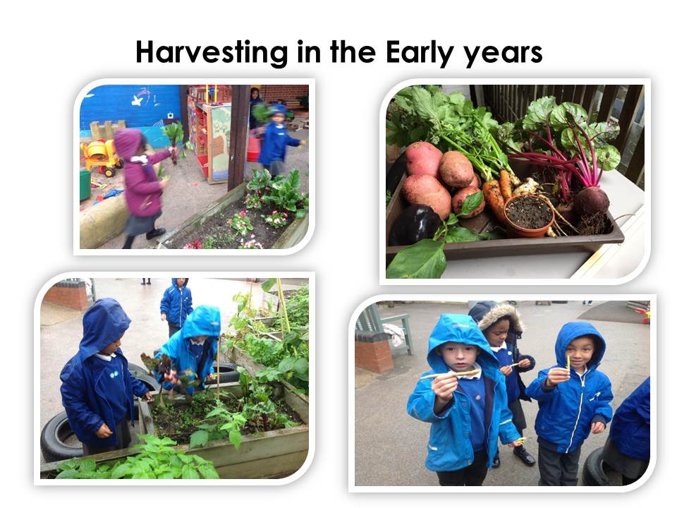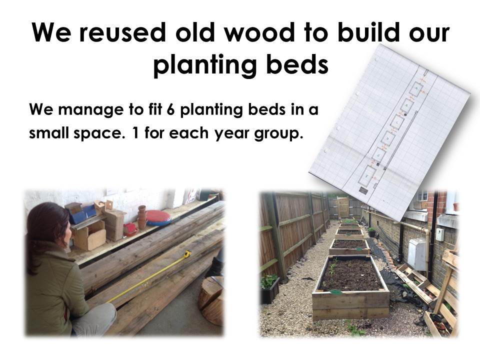 Our edible garden provides a growing area big enough for every year group to have their own planting bed. We are also crating new ways of growing using the walls and re-using different materials to teach children that what they might perceive as rubbish can still be used for something new.